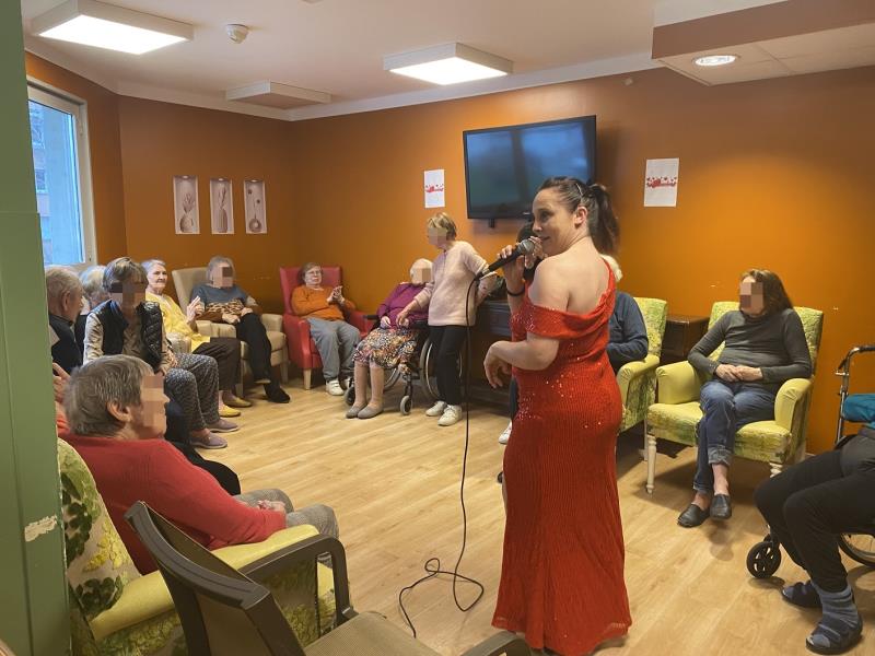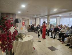 L’après-midi s’est poursuivi avec un spectacle d’une chanteuse lyrique, dont la voix enchanteresse a transporté résidents et familles dans un univers musical dédié à l’amour. À travers un répertoire soigneusement choisi, elle a su toucher les cœurs et raviver de nombreux souvenirs. La présence des proches a renforcé la dimension intergénérationnelle de ce moment, favorisant les échanges et la création de souvenirs communs.